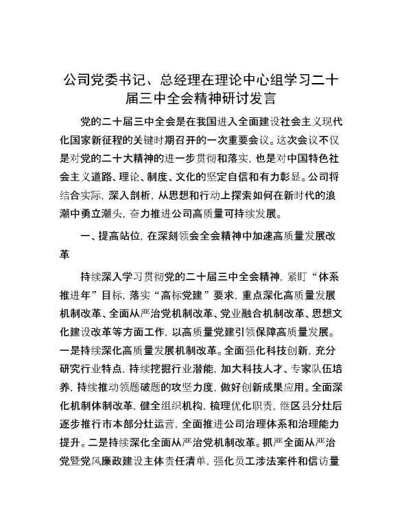公司党委书记、总经理在理论中心组学习二十届三中全会精神研讨发言 2024-10-08 Word模板 93 购买前,请一定要先点击这里看看,欢迎持续关注,精彩模板每天推送 预览结束,本文件为word文档,一共5页,共2241字,请购买后,下载后查看 购买前,请一定要先点击这里看看,欢迎持续关注,精彩模板每天推送 资源下载下载价格29 RMBVIP免费升级VIP点击检测网盘有效后购买有任何充值和下载问题请加微信:xuexixuexi66 0 演讲发言