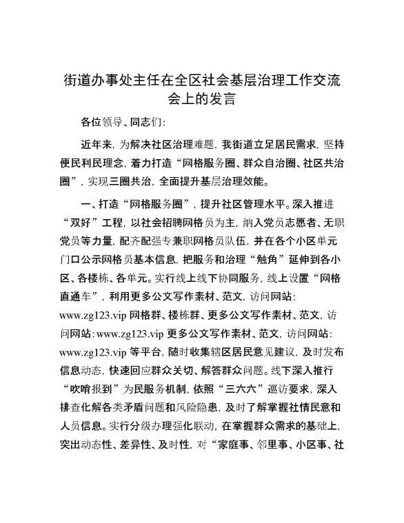 街道办事处主任在全区社会基层治理工作交流会上的发言 2024-10-08 Word模板 101 购买前,请一定要先点击这里看看,欢迎持续关注,精彩模板每天推送 预览结束,本文件为word文档,一共3页,共1075字,请购买后,下载后查看 购买前,请一定要先点击这里看看,欢迎持续关注,精彩模板每天推送 资源下载下载价格29 RMBVIP免费升级VIP点击检测网盘有效后购买有任何充值和下载问题请加微信:xuexixuexi66 0 演讲发言