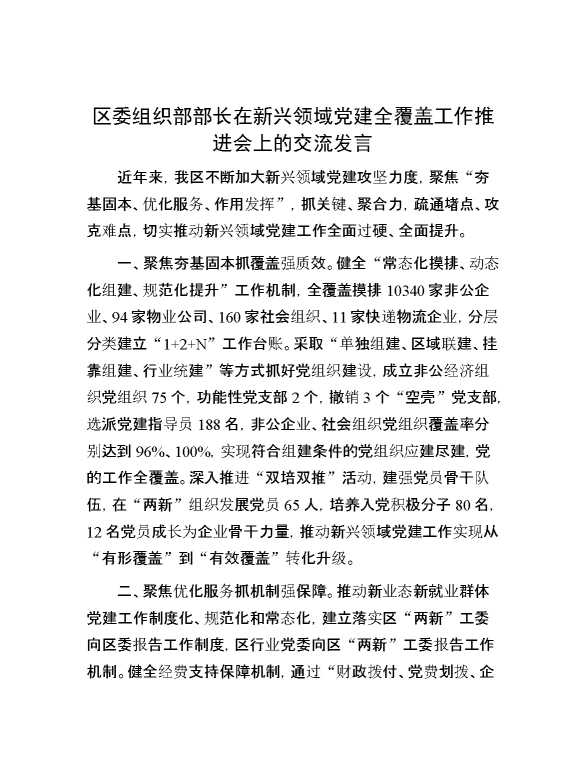 区委组织部部长在新兴领域党建全覆盖工作推进会上的交流发言 2024-10-08 Word模板 94 购买前,请一定要先点击这里看看,欢迎持续关注,精彩模板每天推送 预览结束,本文件为word文档,一共2页,共847字,请购买后,下载后查看 购买前,请一定要先点击这里看看,欢迎持续关注,精彩模板每天推送 资源下载下载价格29 RMBVIP免费升级VIP点击检测网盘有效后购买有任何充值和下载问题请加微信:xuexixuexi66 0 演讲发言