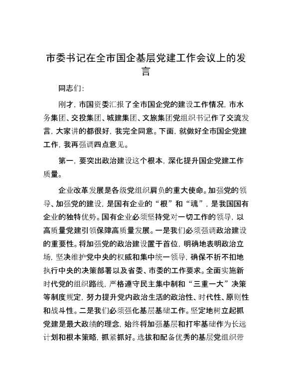 市委书记在全市国企基层党建工作会议上的发言 2024-10-08 Word模板 93 购买前,请一定要先点击这里看看,欢迎持续关注,精彩模板每天推送 预览结束,本文件为word文档,一共5页,共2073字,请购买后,下载后查看 购买前,请一定要先点击这里看看,欢迎持续关注,精彩模板每天推送 资源下载下载价格29 RMBVIP免费升级VIP点击检测网盘有效后购买有任何充值和下载问题请加微信:xuexixuexi66 0 演讲发言