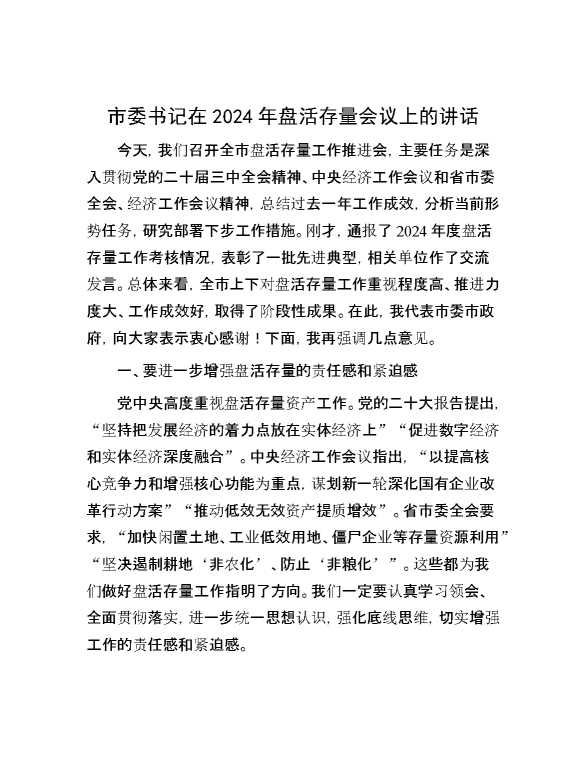 市委书记在2024年盘活存量会议上的讲话 2024-10-08 Word模板 104 购买前,请一定要先点击这里看看,欢迎持续关注,精彩模板每天推送 预览结束,本文件为word文档,一共6页,共2463字,请购买后,下载后查看 购买前,请一定要先点击这里看看,欢迎持续关注,精彩模板每天推送 资源下载下载价格29 RMBVIP免费升级VIP点击检测网盘有效后购买有任何充值和下载问题请加微信:xuexixuexi66 0 演讲发言