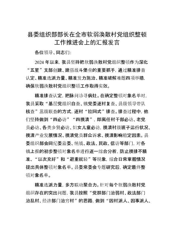 县委组织部部长在全市软弱涣散村党组织整顿工作推进会上的汇报发言 2024-10-08 Word模板 101 购买前,请一定要先点击这里看看,欢迎持续关注,精彩模板每天推送 预览结束,本文件为word文档,一共3页,共1119字,请购买后,下载后查看 购买前,请一定要先点击这里看看,欢迎持续关注,精彩模板每天推送 资源下载下载价格29 RMBVIP免费升级VIP点击检测网盘有效后购买有任何充值和下载问题请加微信:xuexixuexi66 0 演讲发言