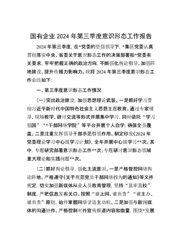国有企业2024年第三季度意识形态工作报告 2024-10-08 Word模板 73 购买前,请一定要先点击这里看看,欢迎持续关注,精彩模板每天推送 预览结束,本文件为word文档,一共5页,共1952字,请购买后,下载后查看 购买前,请一定要先点击这里看看,欢迎持续关注,精彩模板每天推送 资源下载下载价格29 RMBVIP免费升级VIP点击检测网盘有效后购买有任何充值和下载问题请加微信:xuexixuexi66 0 总结汇报