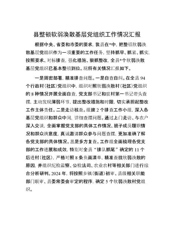 县整顿软弱涣散基层党组织工作情况汇报 2024-10-08 Word模板 86 购买前,请一定要先点击这里看看,欢迎持续关注,精彩模板每天推送 预览结束,本文件为word文档,一共3页,共1412字,请购买后,下载后查看 购买前,请一定要先点击这里看看,欢迎持续关注,精彩模板每天推送 资源下载下载价格29 RMBVIP免费升级VIP点击检测网盘有效后购买有任何充值和下载问题请加微信:xuexixuexi66 0 总结汇报