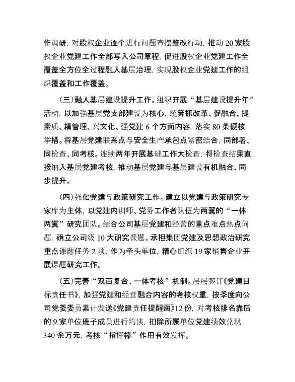 国有企业关于推动基层党建与公司治理深度融合工作情况的报告 2024-10-08 Word模板 92 购买前,请一定要先点击这里看看,欢迎持续关注,精彩模板每天推送 预览结束,本文件为word文档,一共5页,共2248字,请购买后,下载后查看 购买前,请一定要先点击这里看看,欢迎持续关注,精彩模板每天推送 资源下载下载价格29 RMBVIP免费升级VIP点击检测网盘有效后购买有任何充值和下载问题请加微信:xuexixuexi66 0 总结汇报