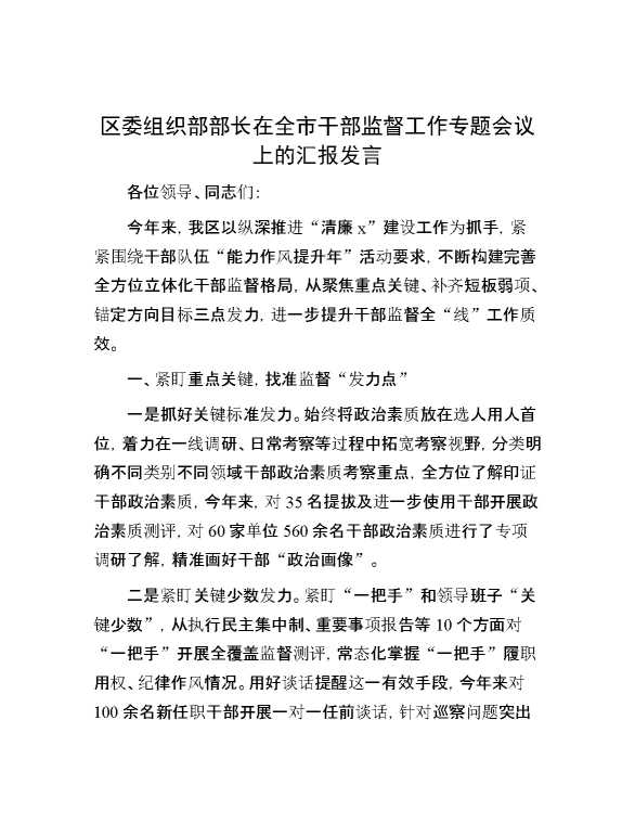 区委组织部部长在全市干部监督工作专题会议上的汇报发言 2024-10-10 Word模板 105 购买前,请一定要先点击这里看看,欢迎持续关注,精彩模板每天推送 预览结束,本文件为word文档,一共4页,共1468字,请购买后,下载后查看 购买前,请一定要先点击这里看看,欢迎持续关注,精彩模板每天推送 资源下载下载价格29 RMBVIP免费升级VIP点击检测网盘有效后购买有任何充值和下载问题请加微信:xuexixuexi66 0 演讲发言