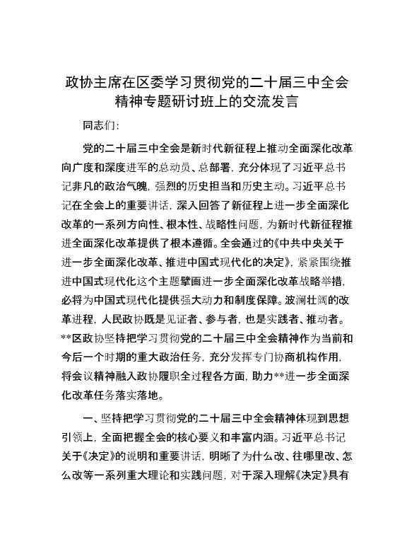 政协主席在区委学习贯彻党的二十届三中全会精神专题研讨班上的交流发言 2024-10-10 Word模板 110 购买前,请一定要先点击这里看看,欢迎持续关注,精彩模板每天推送 预览结束,本文件为word文档,一共5页,共2367字,请购买后,下载后查看 购买前,请一定要先点击这里看看,欢迎持续关注,精彩模板每天推送 资源下载下载价格29 RMBVIP免费升级VIP立即购买有任何充值和下载问题请加微信:xuexixuexi66 0 演讲发言