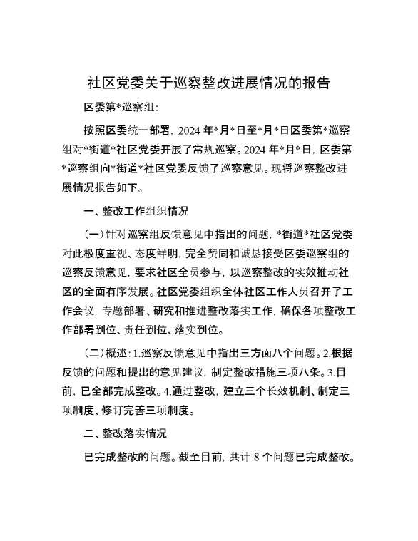 社区党委关于巡察整改进展情况的报告 2024-10-10 Word模板 88 购买前,请一定要先点击这里看看,欢迎持续关注,精彩模板每天推送 预览结束,本文件为word文档,一共6页,共2415字,请购买后,下载后查看 购买前,请一定要先点击这里看看,欢迎持续关注,精彩模板每天推送 资源下载下载价格29 RMBVIP免费升级VIP点击检测网盘有效后购买有任何充值和下载问题请加微信:xuexixuexi66 0 总结汇报
