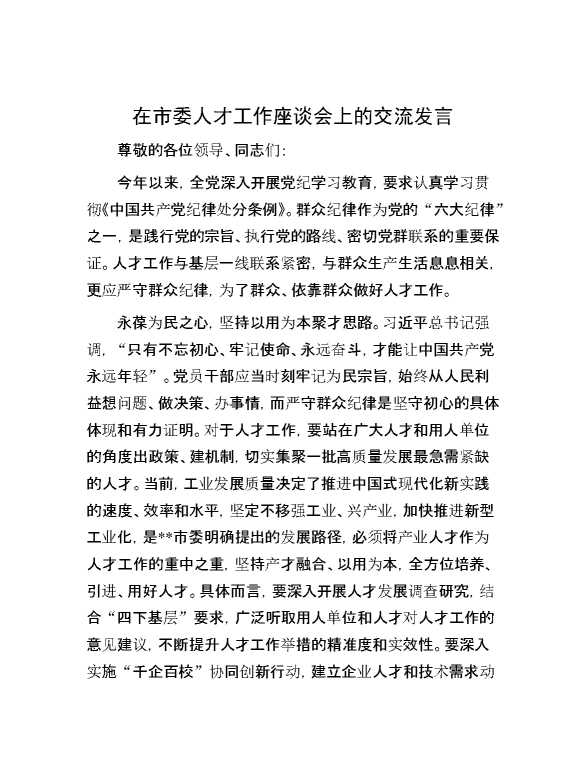 在市委人才工作座谈会上的交流发言 2024-10-10 Word模板 86 购买前,请一定要先点击这里看看,欢迎持续关注,精彩模板每天推送 预览结束,本文件为word文档,一共3页,共1443字,请购买后,下载后查看 购买前,请一定要先点击这里看看,欢迎持续关注,精彩模板每天推送 资源下载下载价格29 RMBVIP免费升级VIP点击检测网盘有效后购买有任何充值和下载问题请加微信:xuexixuexi66 0 演讲发言