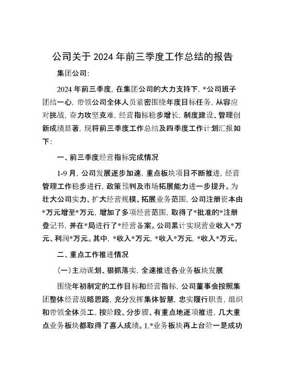 公司关于2024年前三季度工作总结的报告 2024-10-10 Word模板 86 购买前,请一定要先点击这里看看,欢迎持续关注,精彩模板每天推送 预览结束,本文件为word文档,一共7页,共3304字,请购买后,下载后查看 购买前,请一定要先点击这里看看,欢迎持续关注,精彩模板每天推送 资源下载下载价格29 RMBVIP免费升级VIP点击检测网盘有效后购买有任何充值和下载问题请加微信:xuexixuexi66 0 总结汇报