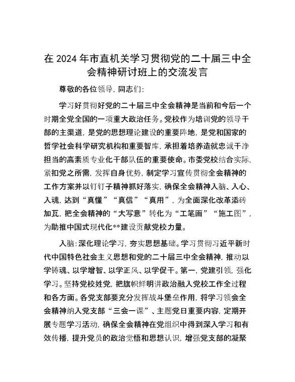 在2024年市直机关学习贯彻党的二十届三中全会精神研讨班上的交流发言 2024-10-10 Word模板 85 购买前,请一定要先点击这里看看,欢迎持续关注,精彩模板每天推送 预览结束,本文件为word文档,一共4页,共1952字,请购买后,下载后查看 购买前,请一定要先点击这里看看,欢迎持续关注,精彩模板每天推送 资源下载下载价格29 RMBVIP免费升级VIP点击检测网盘有效后购买有任何充值和下载问题请加微信:xuexixuexi66 0 演讲发言