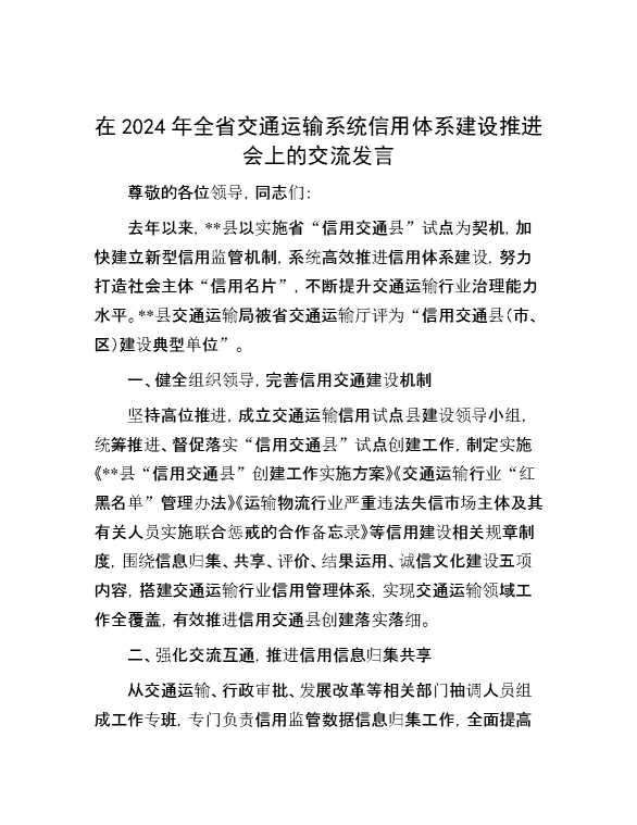 在2024年全省交通运输系统信用体系建设推进会上的交流发言 2024-10-10 Word模板 110 购买前,请一定要先点击这里看看,欢迎持续关注,精彩模板每天推送 预览结束,本文件为word文档,一共3页,共1185字,请购买后,下载后查看 购买前,请一定要先点击这里看看,欢迎持续关注,精彩模板每天推送 资源下载下载价格29 RMBVIP免费升级VIP点击检测网盘有效后购买有任何充值和下载问题请加微信:xuexixuexi66 0 演讲发言