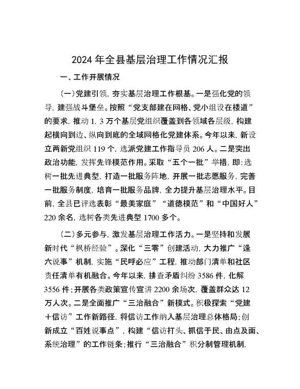 2024年全县基层治理工作情况汇报 2024-10-12 Word模板 96 购买前,请一定要先点击这里看看,欢迎持续关注,精彩模板每天推送 预览结束,本文件为word文档,一共5页,共2452字,请购买后,下载后查看 购买前,请一定要先点击这里看看,欢迎持续关注,精彩模板每天推送 资源下载下载价格29 RMBVIP免费升级VIP点击检测网盘有效后购买有任何充值和下载问题请加微信:xuexixuexi66 0 总结汇报