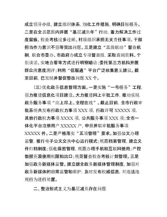 2024年市审批局整治形式主义为基层减负工作情况报告 2024-10-12 Word模板 92 购买前,请一定要先点击这里看看,欢迎持续关注,精彩模板每天推送 预览结束,本文件为word文档,一共5页,共2132字,请购买后,下载后查看 购买前,请一定要先点击这里看看,欢迎持续关注,精彩模板每天推送 资源下载下载价格29 RMBVIP免费升级VIP点击检测网盘有效后购买有任何充值和下载问题请加微信:xuexixuexi66 0 总结汇报