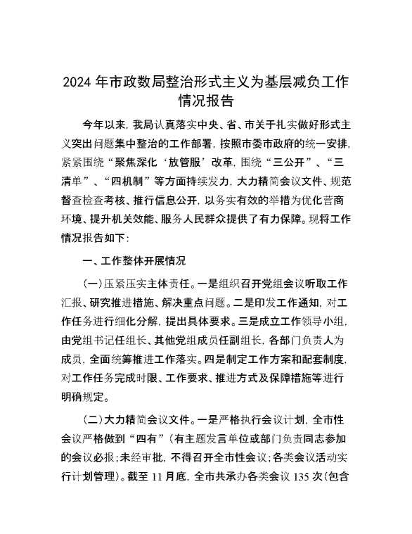 2024年市政数局整治形式主义为基层减负工作情况报告 2024-10-12 Word模板 86 购买前,请一定要先点击这里看看,欢迎持续关注,精彩模板每天推送 预览结束,本文件为word文档,一共5页,共2379字,请购买后,下载后查看 购买前,请一定要先点击这里看看,欢迎持续关注,精彩模板每天推送 资源下载下载价格29 RMBVIP免费升级VIP点击检测网盘有效后购买有任何充值和下载问题请加微信:xuexixuexi66 0 总结汇报