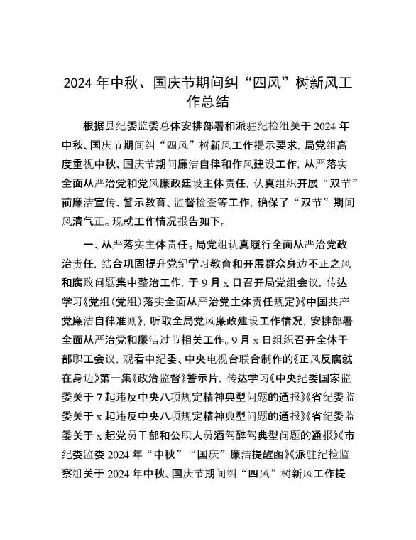 2024年中秋、国庆节期间纠“四风”树新风工作总结 2024-10-12 Word模板 106 购买前,请一定要先点击这里看看,欢迎持续关注,精彩模板每天推送 预览结束,本文件为word文档,一共3页,共1442字,请购买后,下载后查看 购买前,请一定要先点击这里看看,欢迎持续关注,精彩模板每天推送 资源下载下载价格29 RMBVIP免费升级VIP点击检测网盘有效后购买有任何充值和下载问题请加微信:xuexixuexi66 0 总结汇报