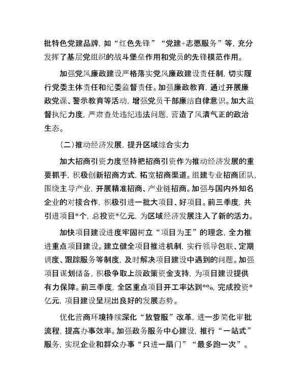 区党委书记 2024 年前三季度工作总结述职报告 2024-10-12 Word模板 92 购买前,请一定要先点击这里看看,欢迎持续关注,精彩模板每天推送 预览结束,本文件为word文档,一共9页,共3351字,请购买后,下载后查看 购买前,请一定要先点击这里看看,欢迎持续关注,精彩模板每天推送 资源下载下载价格29 RMBVIP免费升级VIP点击检测网盘有效后购买有任何充值和下载问题请加微信:xuexixuexi66 0 总结汇报