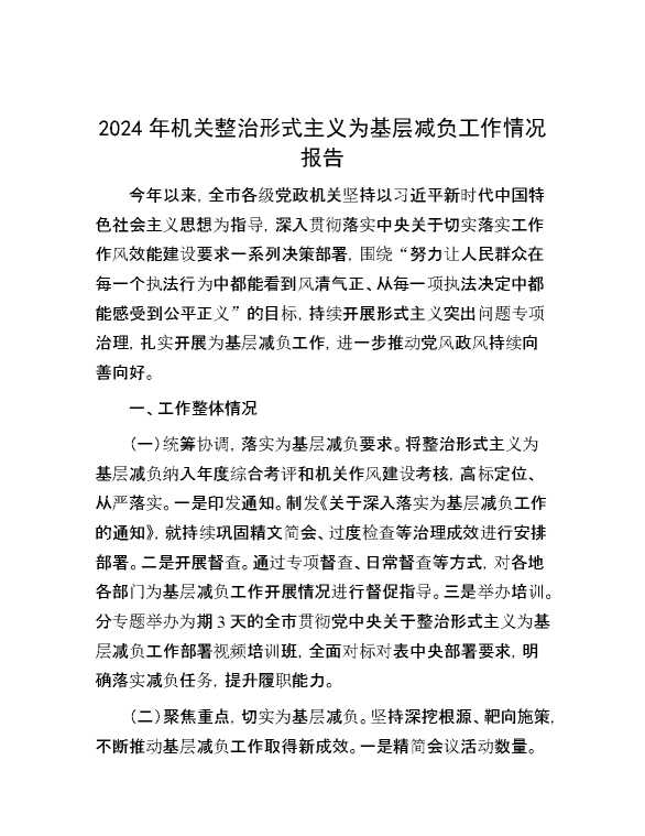 2024年机关整治形式主义为基层减负工作情况报告 2024-10-12 Word模板 98 购买前,请一定要先点击这里看看,欢迎持续关注,精彩模板每天推送 预览结束,本文件为word文档,一共4页,共1843字,请购买后,下载后查看 购买前,请一定要先点击这里看看,欢迎持续关注,精彩模板每天推送 资源下载下载价格29 RMBVIP免费升级VIP点击检测网盘有效后购买有任何充值和下载问题请加微信:xuexixuexi66 0 总结汇报