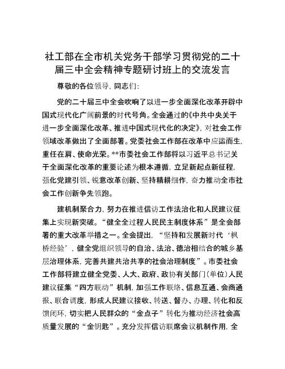 社工部在全市机关党务干部学习贯彻党的二十届三中全会精神专题研讨班上的交流发言 2024-10-12 Word模板 93 购买前,请一定要先点击这里看看,欢迎持续关注,精彩模板每天推送 预览结束,本文件为word文档,一共4页,共1646字,请购买后,下载后查看 购买前,请一定要先点击这里看看,欢迎持续关注,精彩模板每天推送 资源下载下载价格29 RMBVIP免费升级VIP点击检测网盘有效后购买有任何充值和下载问题请加微信:xuexixuexi66 0 演讲发言