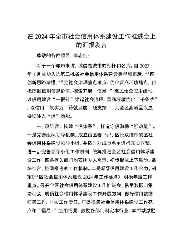 在2024年全市社会信用体系建设工作推进会上的汇报发言 2024-10-12 Word模板 101 购买前,请一定要先点击这里看看,欢迎持续关注,精彩模板每天推送 预览结束,本文件为word文档,一共5页,共2165字,请购买后,下载后查看 购买前,请一定要先点击这里看看,欢迎持续关注,精彩模板每天推送 资源下载下载价格29 RMBVIP免费升级VIP点击检测网盘有效后购买有任何充值和下载问题请加微信:xuexixuexi66 0 演讲发言