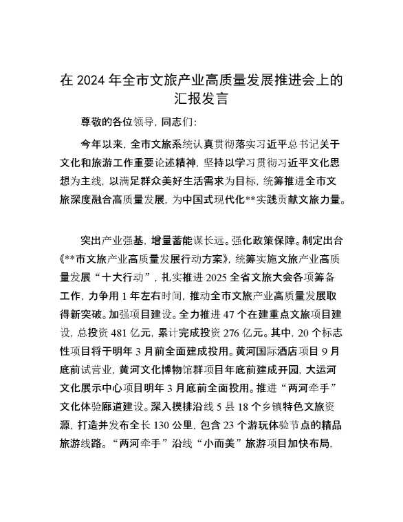 在2024年全市文旅产业高质量发展推进会上的汇报发言 2024-10-12 Word模板 111 购买前,请一定要先点击这里看看,欢迎持续关注,精彩模板每天推送 预览结束,本文件为word文档,一共4页,共1600字,请购买后,下载后查看 购买前,请一定要先点击这里看看,欢迎持续关注,精彩模板每天推送 资源下载下载价格29 RMBVIP免费升级VIP点击检测网盘有效后购买有任何充值和下载问题请加微信:xuexixuexi66 0 演讲发言