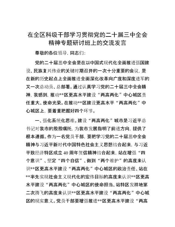 在全区科级干部学习贯彻党的二十届三中全会精神专题研讨班上的交流发言 2024-10-12 Word模板 92 购买前,请一定要先点击这里看看,欢迎持续关注,精彩模板每天推送 预览结束,本文件为word文档,一共4页,共1859字,请购买后,下载后查看 购买前,请一定要先点击这里看看,欢迎持续关注,精彩模板每天推送 资源下载下载价格29 RMBVIP免费升级VIP点击检测网盘有效后购买有任何充值和下载问题请加微信:xuexixuexi66 0 演讲发言