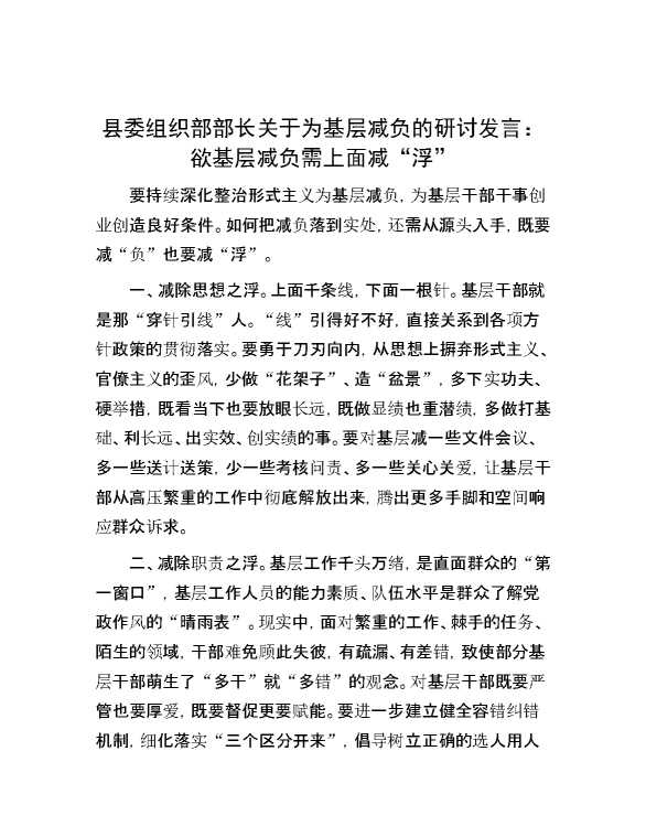 县委组织部部长关于为基层减负的研讨发言:欲基层减负 需上面减“浮” 2024-10-12 Word模板 88 购买前,请一定要先点击这里看看,欢迎持续关注,精彩模板每天推送 预览结束,本文件为word文档,一共2页,共716字,请购买后,下载后查看 购买前,请一定要先点击这里看看,欢迎持续关注,精彩模板每天推送 资源下载下载价格29 RMBVIP免费升级VIP点击检测网盘有效后购买有任何充值和下载问题请加微信:xuexixuexi66 0 演讲发言