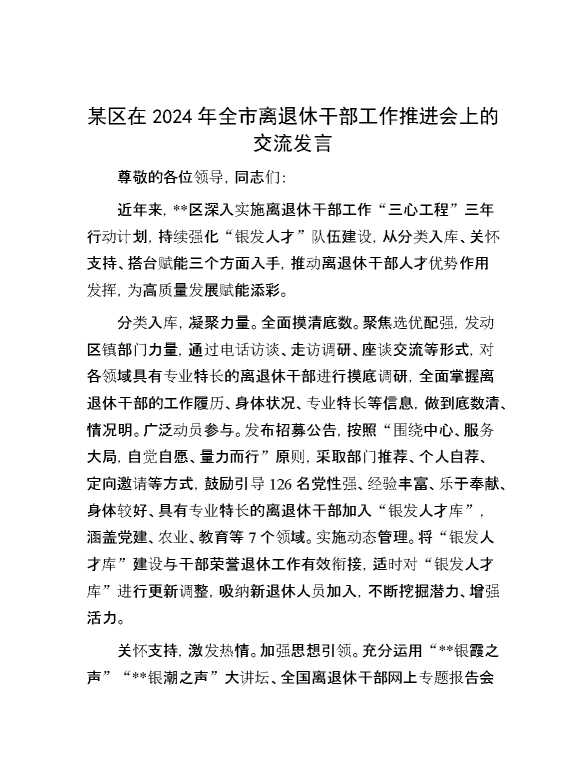 某区在2024年全市离退休干部工作推进会上的交流发言 2024-10-12 Word模板 89 购买前,请一定要先点击这里看看,欢迎持续关注,精彩模板每天推送 预览结束,本文件为word文档,一共3页,共1295字,请购买后,下载后查看 购买前,请一定要先点击这里看看,欢迎持续关注,精彩模板每天推送 资源下载下载价格29 RMBVIP免费升级VIP点击检测网盘有效后购买有任何充值和下载问题请加微信:xuexixuexi66 0 演讲发言