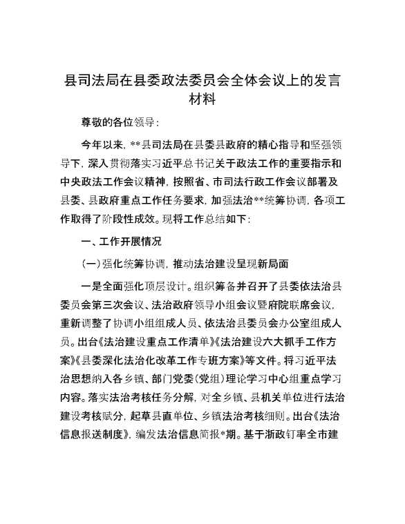 县司法局在县委政法委员会全体会议上的发言材料 2024-10-12 Word模板 132 购买前,请一定要先点击这里看看,欢迎持续关注,精彩模板每天推送 预览结束,本文件为word文档,一共6页,共2654字,请购买后,下载后查看 购买前,请一定要先点击这里看看,欢迎持续关注,精彩模板每天推送 资源下载下载价格29 RMBVIP免费升级VIP点击检测网盘有效后购买有任何充值和下载问题请加微信:xuexixuexi66 0 演讲发言