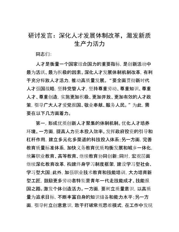 研讨发言:深化人才发展体制改革,激发新质生产力活力 2024-10-12 Word模板 88 购买前,请一定要先点击这里看看,欢迎持续关注,精彩模板每天推送 预览结束,本文件为word文档,一共4页,共1492字,请购买后,下载后查看 购买前,请一定要先点击这里看看,欢迎持续关注,精彩模板每天推送 资源下载下载价格29 RMBVIP免费升级VIP点击检测网盘有效后购买有任何充值和下载问题请加微信:xuexixuexi66 0 演讲发言