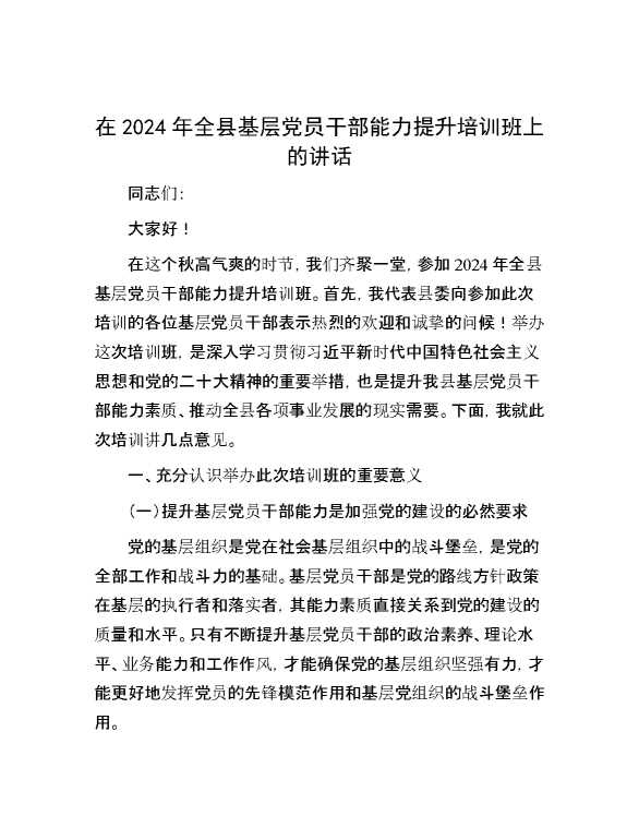 在 2024 年全县基层党员干部能力提升培训班上的讲话 2024-10-12 Word模板 89 购买前,请一定要先点击这里看看,欢迎持续关注,精彩模板每天推送 预览结束,本文件为word文档,一共6页,共2129字,请购买后,下载后查看 购买前,请一定要先点击这里看看,欢迎持续关注,精彩模板每天推送 资源下载下载价格29 RMBVIP免费升级VIP点击检测网盘有效后购买有任何充值和下载问题请加微信:xuexixuexi66 0 演讲发言