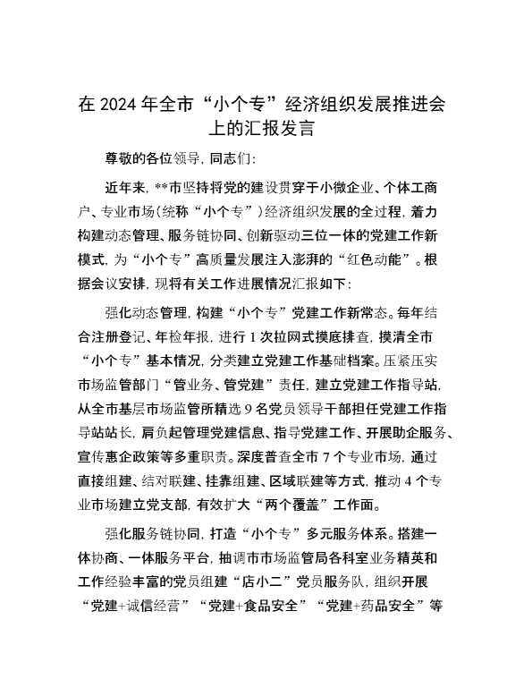 在2024年全市“小个专”经济组织发展推进会上的汇报发言 2024-10-12 Word模板 94 购买前,请一定要先点击这里看看,欢迎持续关注,精彩模板每天推送 预览结束,本文件为word文档,一共2页,共933字,请购买后,下载后查看 购买前,请一定要先点击这里看看,欢迎持续关注,精彩模板每天推送 资源下载下载价格29 RMBVIP免费升级VIP点击检测网盘有效后购买有任何充值和下载问题请加微信:xuexixuexi66 0 演讲发言