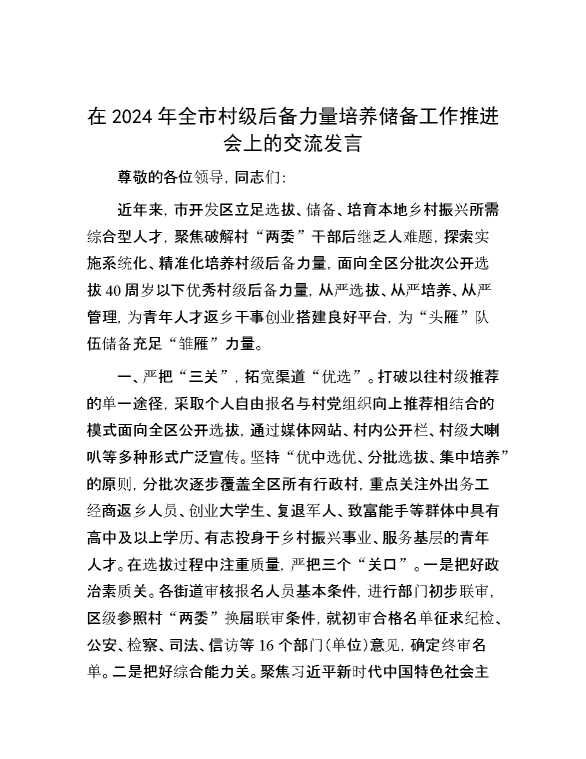 在2024年全市村级后备力量培养储备工作推进会上的交流发言 2024-10-12 Word模板 90 购买前,请一定要先点击这里看看,欢迎持续关注,精彩模板每天推送 预览结束,本文件为word文档,一共4页,共1570字,请购买后,下载后查看 购买前,请一定要先点击这里看看,欢迎持续关注,精彩模板每天推送 资源下载下载价格29 RMBVIP免费升级VIP点击检测网盘有效后购买有任何充值和下载问题请加微信:xuexixuexi66 0 演讲发言