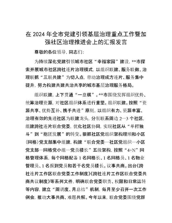 在2024年全市党建引领基层治理重点工作暨加强社区治理推进会上的汇报发言 2024-10-12 Word模板 122 购买前,请一定要先点击这里看看,欢迎持续关注,精彩模板每天推送 预览结束,本文件为word文档,一共4页,共1624字,请购买后,下载后查看 购买前,请一定要先点击这里看看,欢迎持续关注,精彩模板每天推送 资源下载下载价格29 RMBVIP免费升级VIP点击检测网盘有效后购买有任何充值和下载问题请加微信:xuexixuexi66 0 演讲发言