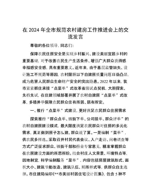 在2024年全市规范农村建房工作推进会上的交流发言 2024-10-12 Word模板 91 购买前,请一定要先点击这里看看,欢迎持续关注,精彩模板每天推送 预览结束,本文件为word文档,一共5页,共2269字,请购买后,下载后查看 购买前,请一定要先点击这里看看,欢迎持续关注,精彩模板每天推送 资源下载下载价格29 RMBVIP免费升级VIP点击检测网盘有效后购买有任何充值和下载问题请加微信:xuexixuexi66 0 演讲发言