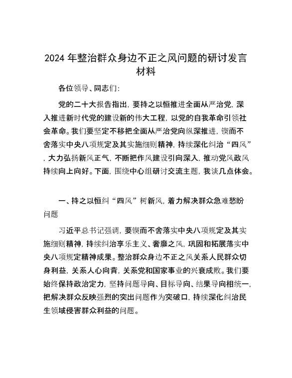 2024年整治群众身边不正之风问题的研讨发言材料 2024-10-12 Word模板 94 购买前,请一定要先点击这里看看,欢迎持续关注,精彩模板每天推送 预览结束,本文件为word文档,一共5页,共2019字,请购买后,下载后查看 购买前,请一定要先点击这里看看,欢迎持续关注,精彩模板每天推送 资源下载下载价格29 RMBVIP免费升级VIP点击检测网盘有效后购买有任何充值和下载问题请加微信:xuexixuexi66 0 演讲发言