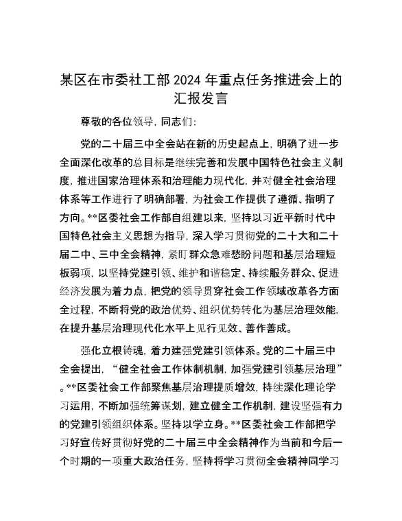 某区在市委社工部2024年重点任务推进会上的汇报发言 2024-10-12 Word模板 94 购买前,请一定要先点击这里看看,欢迎持续关注,精彩模板每天推送 预览结束,本文件为word文档,一共5页,共2314字,请购买后,下载后查看 购买前,请一定要先点击这里看看,欢迎持续关注,精彩模板每天推送 资源下载下载价格29 RMBVIP免费升级VIP点击检测网盘有效后购买有任何充值和下载问题请加微信:xuexixuexi66 0 演讲发言