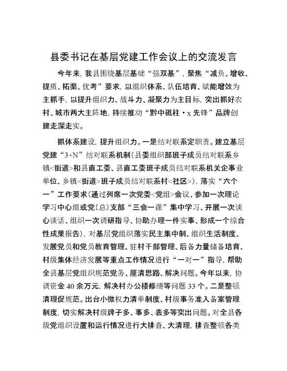 县委书记在基层党建工作会议上的交流发言 2024-10-12 Word模板 96 购买前,请一定要先点击这里看看,欢迎持续关注,精彩模板每天推送 预览结束,本文件为word文档,一共4页,共1565字,请购买后,下载后查看 购买前,请一定要先点击这里看看,欢迎持续关注,精彩模板每天推送 资源下载下载价格29 RMBVIP免费升级VIP点击检测网盘有效后购买有任何充值和下载问题请加微信:xuexixuexi66 0 演讲发言
