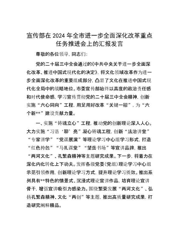 宣传部在2024年全市进一步全面深化改革重点任务推进会上的汇报发言 2024-10-12 Word模板 96 购买前,请一定要先点击这里看看,欢迎持续关注,精彩模板每天推送 预览结束,本文件为word文档,一共4页,共1703字,请购买后,下载后查看 购买前,请一定要先点击这里看看,欢迎持续关注,精彩模板每天推送 资源下载下载价格29 RMBVIP免费升级VIP点击检测网盘有效后购买有任何充值和下载问题请加微信:xuexixuexi66 0 演讲发言