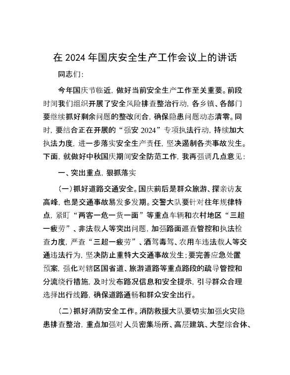 在2024年国庆安全生产工作会议上的讲话 2024-10-12 Word模板 100 购买前,请一定要先点击这里看看,欢迎持续关注,精彩模板每天推送 预览结束,本文件为word文档,一共6页,共2630字,请购买后,下载后查看 购买前,请一定要先点击这里看看,欢迎持续关注,精彩模板每天推送 资源下载下载价格29 RMBVIP免费升级VIP点击检测网盘有效后购买有任何充值和下载问题请加微信:xuexixuexi66 0 演讲发言