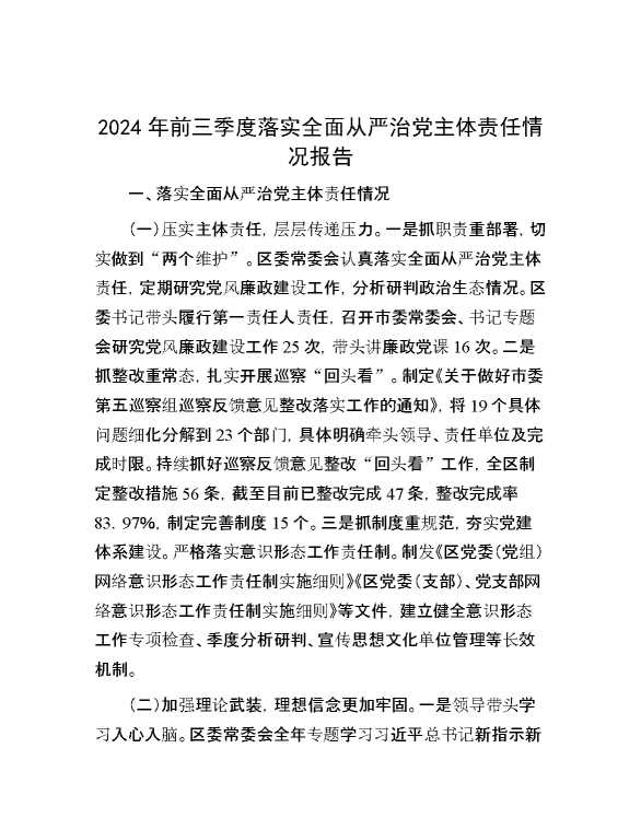 2024年前三季度落实全面从严治党主体责任情况报告 2024-10-14 Word模板 66 购买前,请一定要先点击这里看看,欢迎持续关注,精彩模板每天推送 预览结束,本文件为word文档,一共6页,共2812字,请购买后,下载后查看 购买前,请一定要先点击这里看看,欢迎持续关注,精彩模板每天推送 资源下载下载价格29 RMBVIP免费升级VIP点击检测网盘有效后购买有任何充值和下载问题请加微信:xuexixuexi66 0 总结汇报