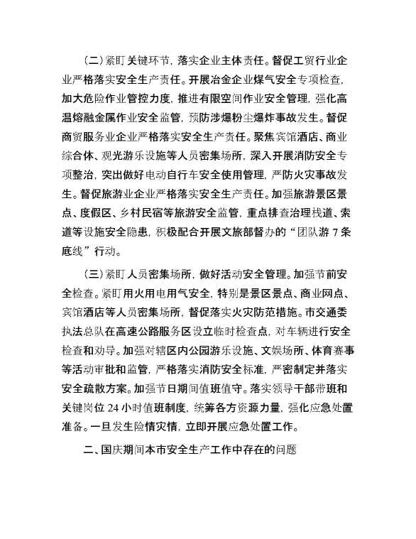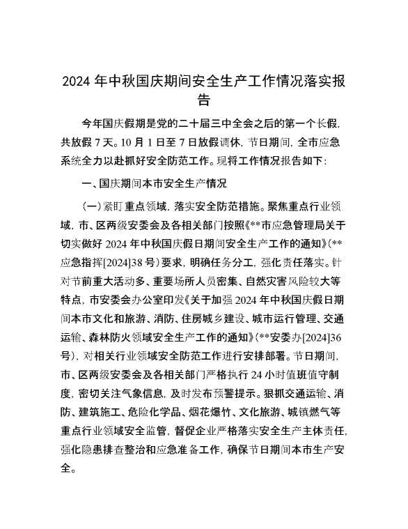 2024年中秋国庆期间安全生产工作情况落实报告 2024-10-14 Word模板 64 购买前,请一定要先点击这里看看,欢迎持续关注,精彩模板每天推送 预览结束,本文件为word文档,一共6页,共2500字,请购买后,下载后查看 购买前,请一定要先点击这里看看,欢迎持续关注,精彩模板每天推送 资源下载下载价格29 RMBVIP免费升级VIP点击检测网盘有效后购买有任何充值和下载问题请加微信:xuexixuexi66 0 总结汇报