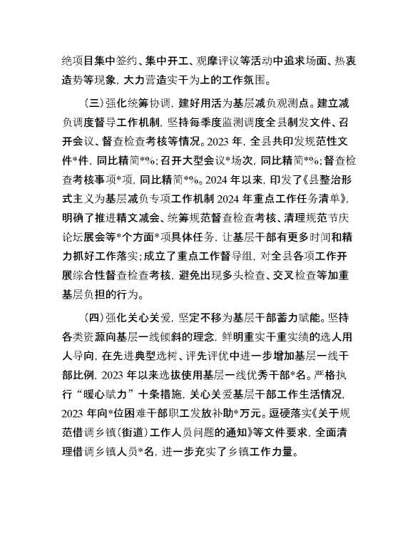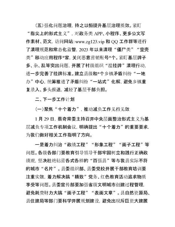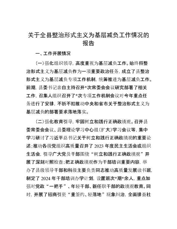 关于全县整治形式主义为基层减负工作情况的报告 2024-10-14 Word模板 63 购买前,请一定要先点击这里看看,欢迎持续关注,精彩模板每天推送 预览结束,本文件为word文档,一共8页,共3850字,请购买后,下载后查看 购买前,请一定要先点击这里看看,欢迎持续关注,精彩模板每天推送 资源下载下载价格29 RMBVIP免费升级VIP点击检测网盘有效后购买有任何充值和下载问题请加微信:xuexixuexi66 0 总结汇报
