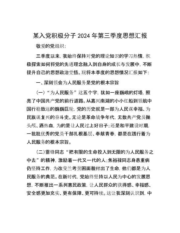 某入党积极分子2024年第三季度思想汇报【43614】 2024-10-14 Word模板 68 购买前,请一定要先点击这里看看,欢迎持续关注,精彩模板每天推送 预览结束,本文件为word文档,一共4页,共1497字,请购买后,下载后查看 购买前,请一定要先点击这里看看,欢迎持续关注,精彩模板每天推送 资源下载下载价格29 RMBVIP免费升级VIP点击检测网盘有效后购买有任何充值和下载问题请加微信:xuexixuexi66 0 总结汇报