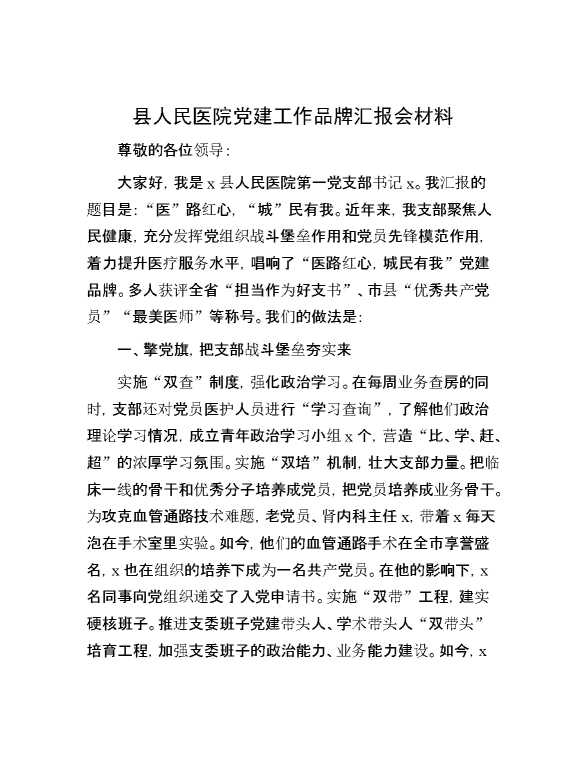 县人民医院党建工作品牌汇报会材料 2024-10-15 Word模板 69 购买前,请一定要先点击这里看看,欢迎持续关注,精彩模板每天推送 预览结束,本文件为word文档,一共3页,共1333字,请购买后,下载后查看 购买前,请一定要先点击这里看看,欢迎持续关注,精彩模板每天推送 资源下载下载价格29 RMBVIP免费升级VIP点击检测网盘有效后购买有任何充值和下载问题请加微信:xuexixuexi66 0 总结汇报