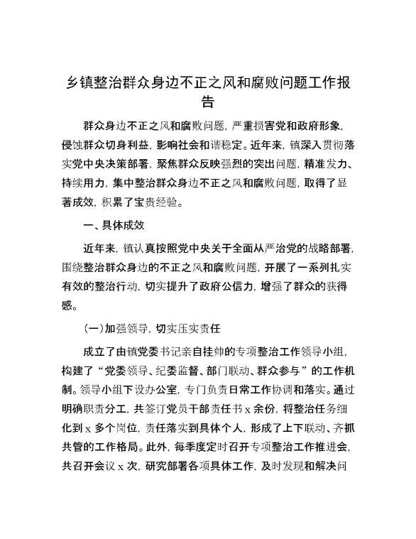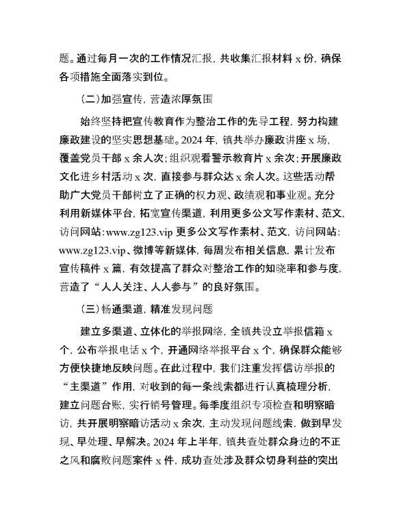 乡镇整治群众身边不正之风和腐败问题工作报告 2024-10-15 Word模板 72 购买前,请一定要先点击这里看看,欢迎持续关注,精彩模板每天推送 预览结束,本文件为word文档,一共7页,共3062字,请购买后,下载后查看 购买前,请一定要先点击这里看看,欢迎持续关注,精彩模板每天推送 资源下载下载价格29 RMBVIP免费升级VIP点击检测网盘有效后购买有任何充值和下载问题请加微信:xuexixuexi66 0 总结汇报