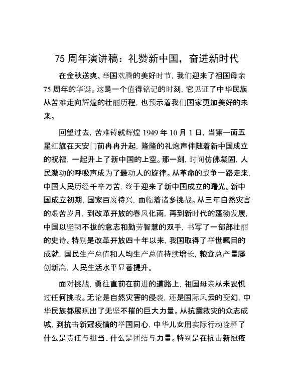 75周年演讲稿:礼赞新中国,奋进新时代 2024-10-15 Word模板 68 购买前,请一定要先点击这里看看,欢迎持续关注,精彩模板每天推送 预览结束,本文件为word文档,一共2页,共905字,请购买后,下载后查看 购买前,请一定要先点击这里看看,欢迎持续关注,精彩模板每天推送 资源下载下载价格29 RMBVIP免费升级VIP点击检测网盘有效后购买有任何充值和下载问题请加微信:xuexixuexi66 0 演讲发言