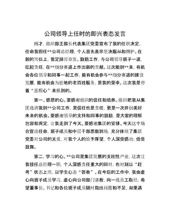 公司领导上任时的即兴表态发言 2024-10-15 Word模板 70 购买前,请一定要先点击这里看看,欢迎持续关注,精彩模板每天推送 预览结束,本文件为word文档,一共2页,共717字,请购买后,下载后查看 购买前,请一定要先点击这里看看,欢迎持续关注,精彩模板每天推送 资源下载下载价格29 RMBVIP免费升级VIP点击检测网盘有效后购买有任何充值和下载问题请加微信:xuexixuexi66 0 演讲发言