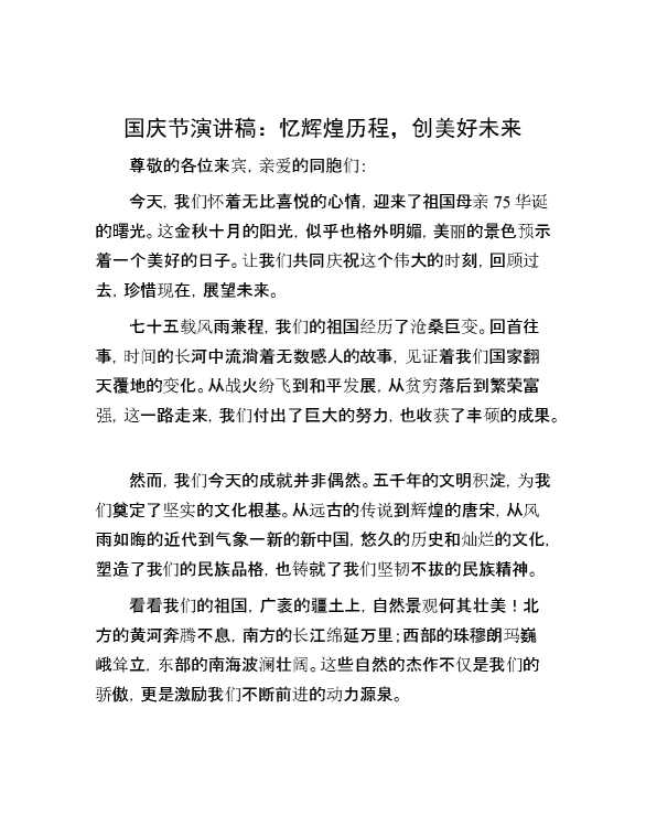 国庆节演讲稿:忆辉煌历程,创美好未来 2024-10-15 Word模板 68 购买前,请一定要先点击这里看看,欢迎持续关注,精彩模板每天推送 预览结束,本文件为word文档,一共2页,共874字,请购买后,下载后查看 购买前,请一定要先点击这里看看,欢迎持续关注,精彩模板每天推送 资源下载下载价格29 RMBVIP免费升级VIP点击检测网盘有效后购买有任何充值和下载问题请加微信:xuexixuexi66 0 演讲发言