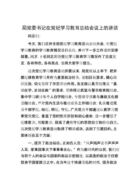 局党委书记在党纪学习教育总结会议上的讲话 2024-10-15 Word模板 72 购买前,请一定要先点击这里看看,欢迎持续关注,精彩模板每天推送 预览结束,本文件为word文档,一共6页,共2838字,请购买后,下载后查看 购买前,请一定要先点击这里看看,欢迎持续关注,精彩模板每天推送 资源下载下载价格29 RMBVIP免费升级VIP点击检测网盘有效后购买有任何充值和下载问题请加微信:xuexixuexi66 0 演讲发言